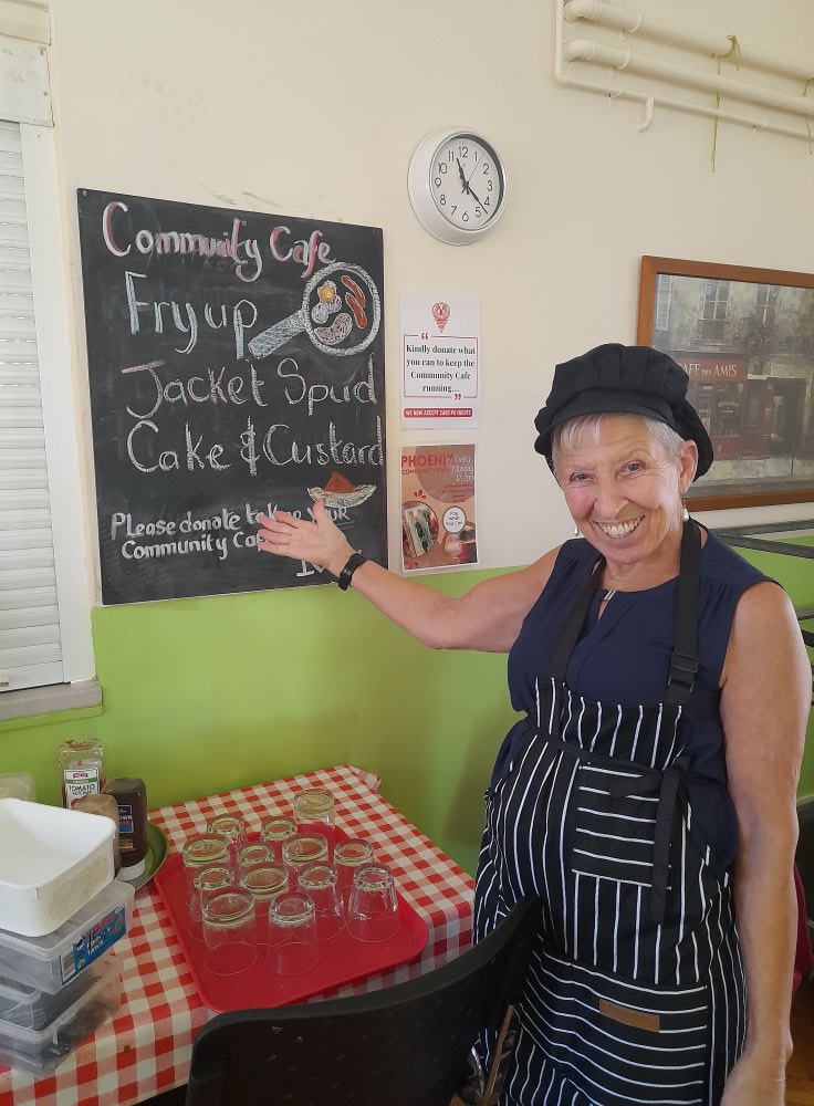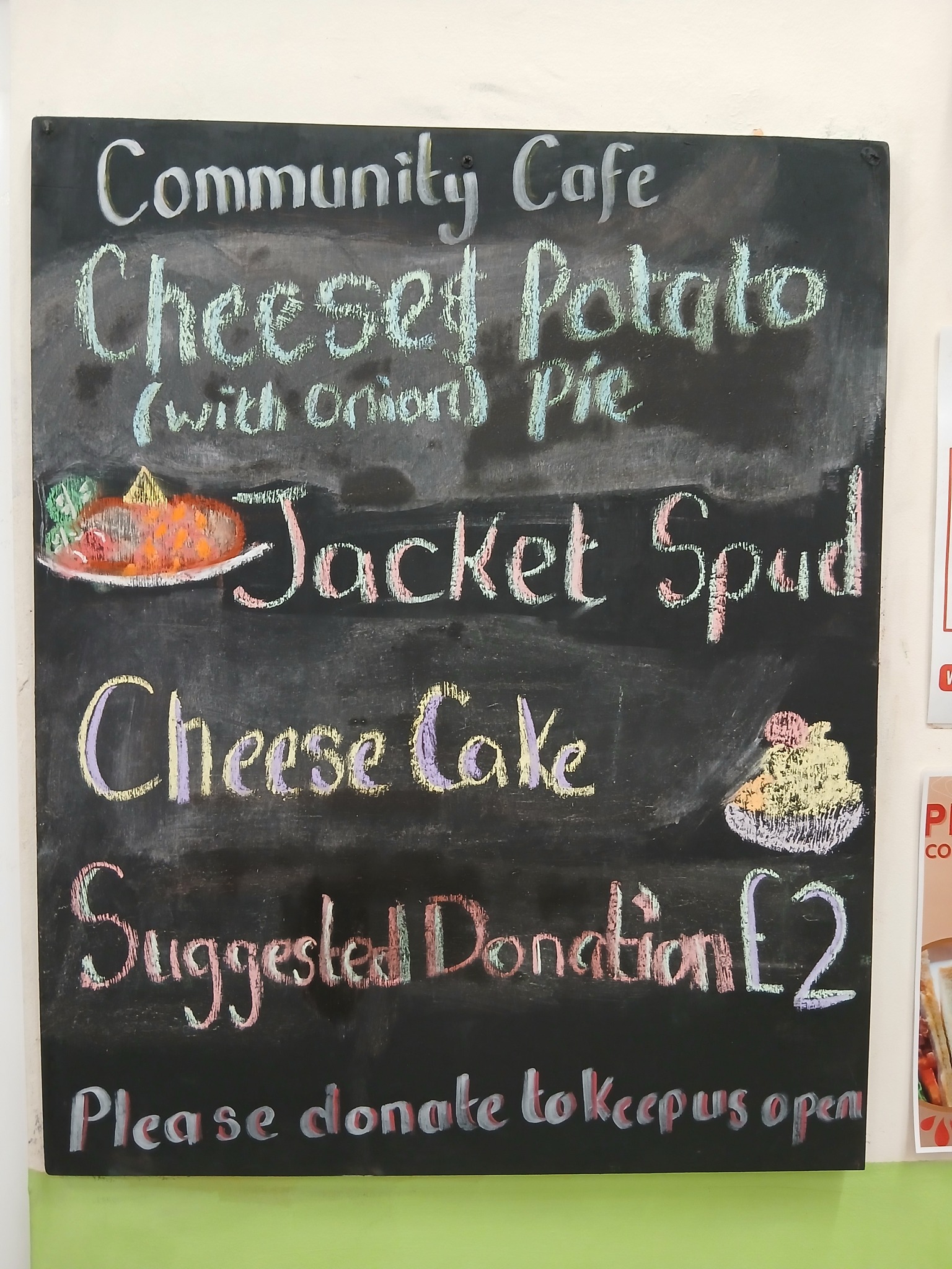 Our volunteer-run Café serves jacket potatoes and a weekly special, including a vegetarian option, plus dessert and unlimited hot drinks.